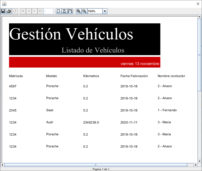 JasperReport a partir del fichero .jasper.JRBeanCollectionDataSource a partir de nuestra colección de datos. Cualquier estructura de datos de Java implementa Collection (ArrayList, LinkedList, HashSet, HashMap, TreeMap, etc)JasperFillManager rellenamos el informe. El método fillReport(), recibe 3 parámetros: el informe, un HashMap con los parámetros (opcional) y la coleccion con los datos.//En este caso utilizamos una colección de tipo HashSet HashSet<Vehiculo> vehiculos = obtenerVehiculos(); JasperReport report = (JasperReport) JRLoader.loadObject(new File("informes/Vehiculos.jasper")); JRBeanCollectionDataSource coleccion = new JRBeanCollectionDataSource(vehiculos); JasperPrint jasperPrint = JasperFillManager.fillReport(report, null, coleccion);
