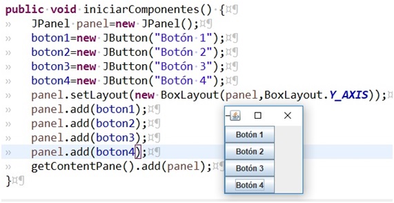 El constructor del BoxLayout es más complejo que el del FlowLayout. Debemos pasarle el contenedor al que lo estamos añadiendo, es decir, el parámetro panel (en el ejemplo). También debemos pasarle si queremos orientación vertical BoxLayout.Y_AXIS u orientación horizontal BoxLayout.X_AXIS.