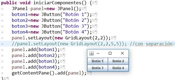También se puede indicar el espacio vertical y horizontal entre componentes en el constructor (5px por defecto).