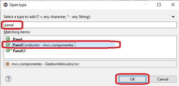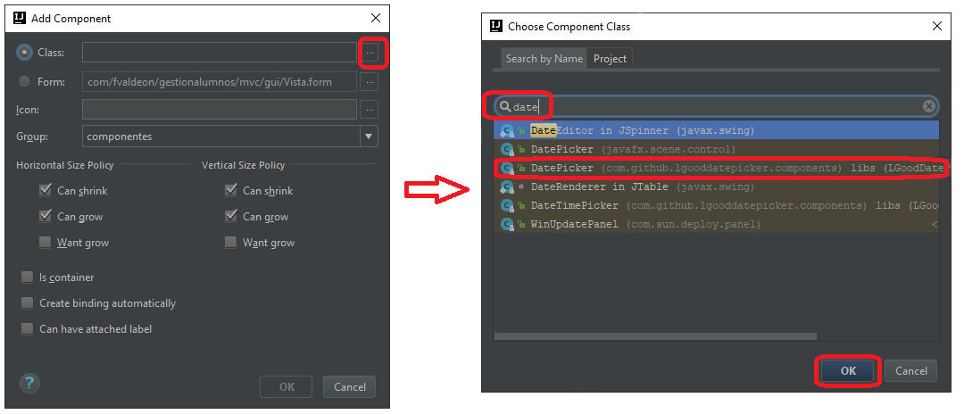 Buscaremos la clase que necesitemos y nos aseguramos que está en el paquete correcto (Puede que exista clases con el mismo nombre). Seleccionamos y pulsamos aceptar en los dos cuadros de dialogos. Con ello hemos conseguido añadir un nuevo componente a nuestra paleta del diseñador.