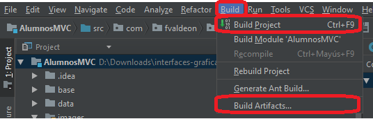 Para generarlo el fichero Jar iremos al menú Build de IntelliJ, y pulsaremos sobre build project en caso de que a la hora de configurar el artifact marcaramos el checkbox que indicamos en esta sección. En caso contratio Pulsamos sobre build artifacts.