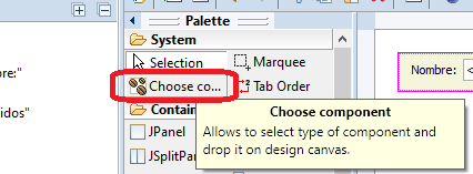 En caso de que necesitemos añadir un componente gráfico de alguna de nuestras librerías, a la paleta de componentes de WindowBuilder, tan solo tenemos que pulsar en Choose components y escribir el nombre de la clase.