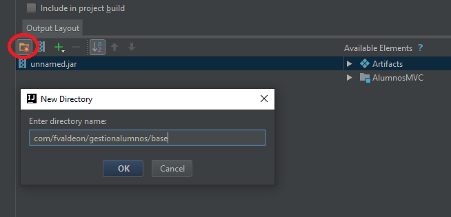 En el siguiente cuadro de dialogo, podemos indicar un nombre para el fichero , indicar si queremos que se cree cuando hagamos un Build del proyecto, y en la sección inferior, si queremos que nuestras librería de clases esté organizada en directorios (del mismo modo que los packages), podemos pulsar sobre el botón crear directorio: