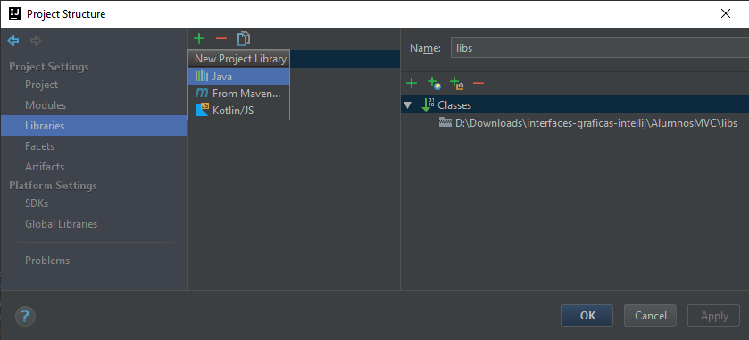 Desde la sección de Project Structure dentro del menú File, podemos añadir librerías a nuestro proyecto: