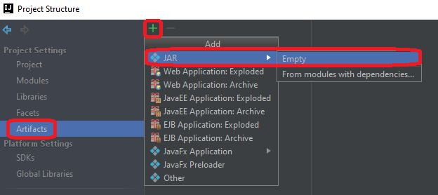 Ahí pulsamos sobre el boton (+) para crear un nuevo artifact Jar vacio.