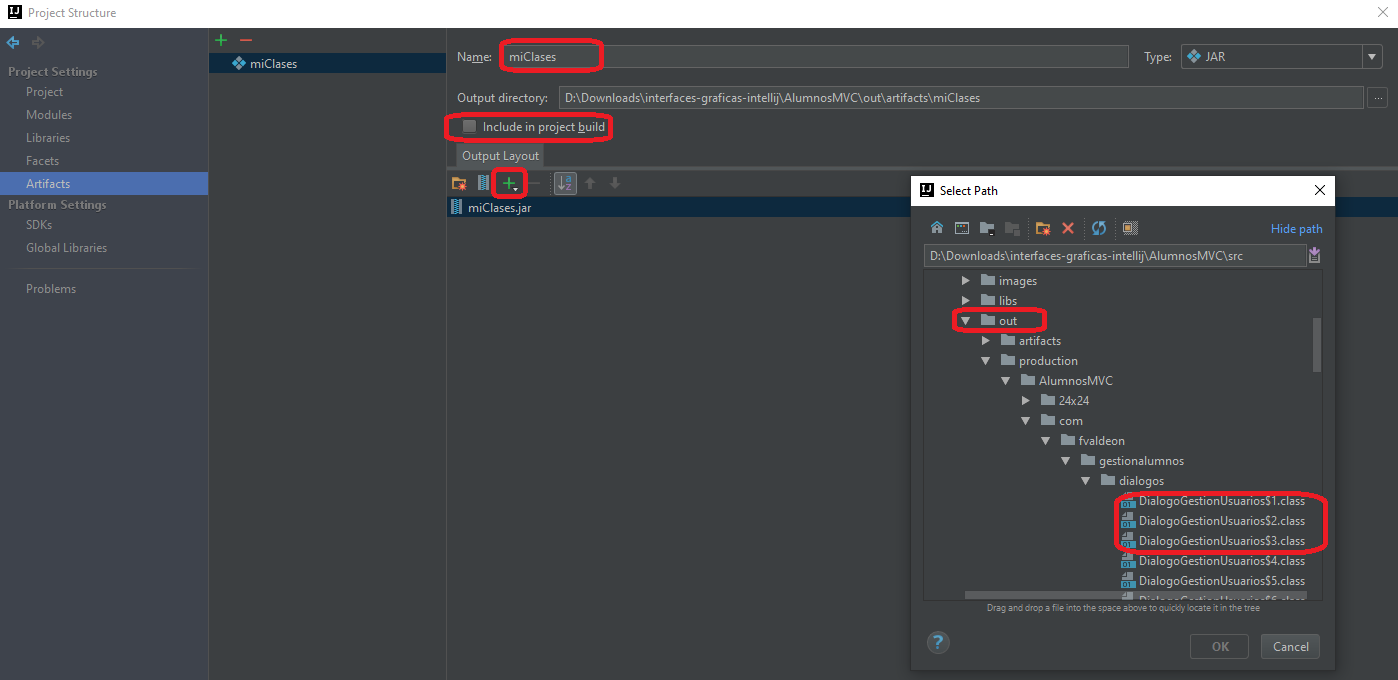 Ahí en el selector de ficheros, buscamos los archivo .class que queramos incluir en nuestro Jar. Una vez indicamos pulsamos sobre aceptar finalizando la creación del artifact.