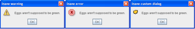//Icono Warning JOptionPane.showMessageDialog(null,"Mensaje", "Titulo", JOptionPane.WARNING_MESSAGE); //Icono Error JOptionPane.showMessageDialog(null,"Mensaje", "Titulo", JOptionPane.ERROR_MESSAGE); //Icono Personalizado JOptionPane.showMessageDialog(null,"Mensaje", "Titulo", JOptionPane.INFORMATION_MESSAGE, icono);