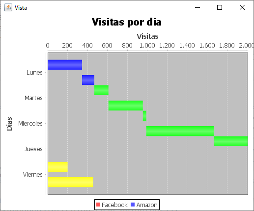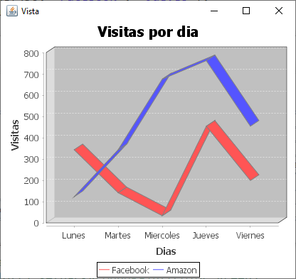 DefaultCategoryDataset dataset = new DefaultCategoryDataset(); dataset.setValue(345, "Facebook", "Lunes"); dataset.setValue(142, "Facebook", "Martes"); dataset.setValue(34, "Facebook", "Miercoles"); dataset.setValue(456, "Facebook", "Jueves"); dataset.setValue(200, "Facebook", "Viernes"); dataset.setValue(123, "Amazon", "Lunes"); dataset.setValue(345, "Amazon", "Martes"); dataset.setValue(678, "Amazon", "Miercoles"); dataset.setValue(765, "Amazon", "Jueves"); dataset.setValue(456, "Amazon", "Viernes");