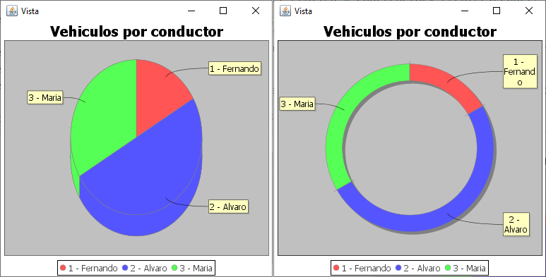 DefaultPieDataset dataset = new DefaultPieDataset(); dataset.setValue("Alvaro", 3); dataset.setValue("Fernando", 1); dataset.setValue("María", 2); JFreeChart grafica = ChartFactory.createPieChart("Vehiculos por conductor", dataset); //También existe el diagrama en 3D JFreeChart grafica = ChartFactory.createPieChart3D("Vehiculos por conductor", dataset);