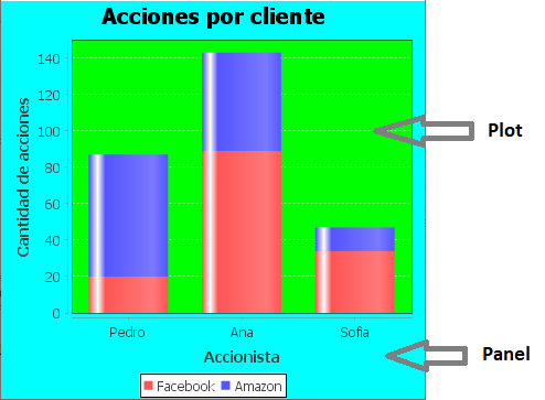 DefaultCategoryDataset dataset = new DefaultCategoryDataset(); dataset.setValue(20, "Facebook", "Pedro"); dataset.setValue(67, "Amazon", "Pedro"); dataset.setValue(54, "Amazon", "Ana"); dataset.setValue(89, "Facebook", "Ana"); dataset.setValue(13, "Amazon", "Sofia"); dataset.setValue(34, "Facebook", "Sofia"); JFreeChart grafica = ChartFactory.createBarChart("Acciones por cliente", "Accionista", "Cantidad de acciones",dataset); //O una misma barra con dos colores por accionista JFreeChart grafica = ChartFactory.createStackedBarChart("Acciones por cliente", "Accionista", "Cantidad de acciones",dataset);