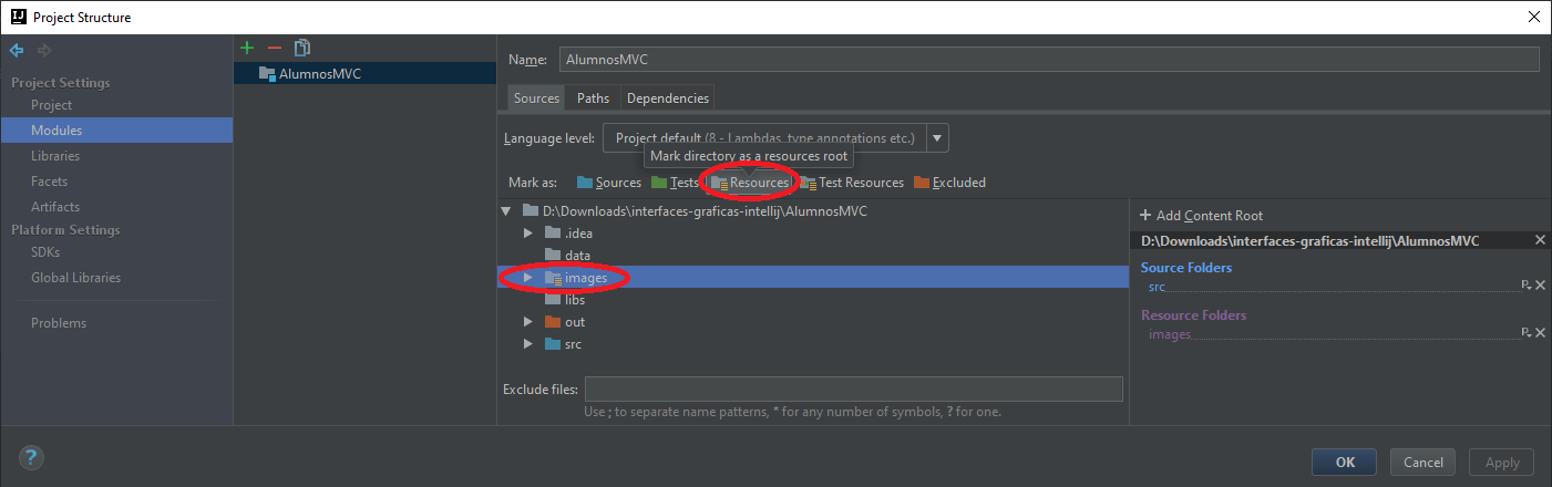 El IDE IntelliJ nos permite indicar los directorios que contienen recursos desde la pestaña File → Project Structure → Modules , tal y como vemos en la siguiente imagen:
